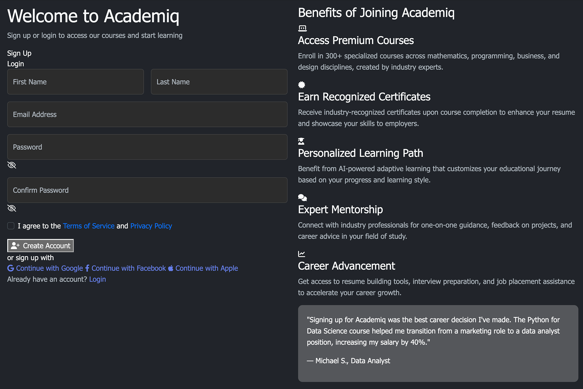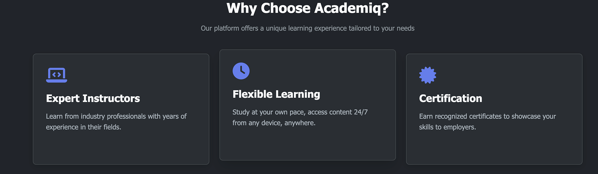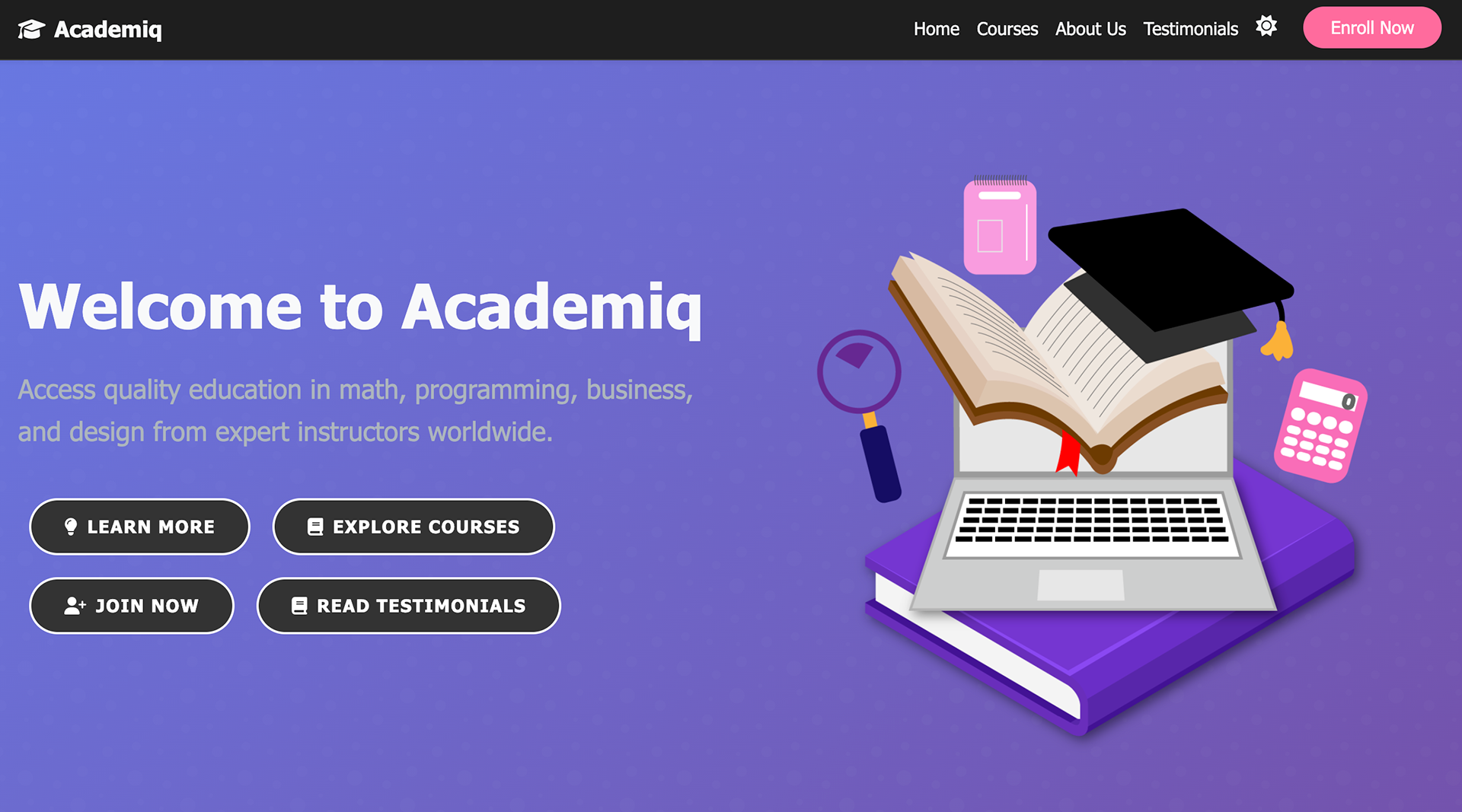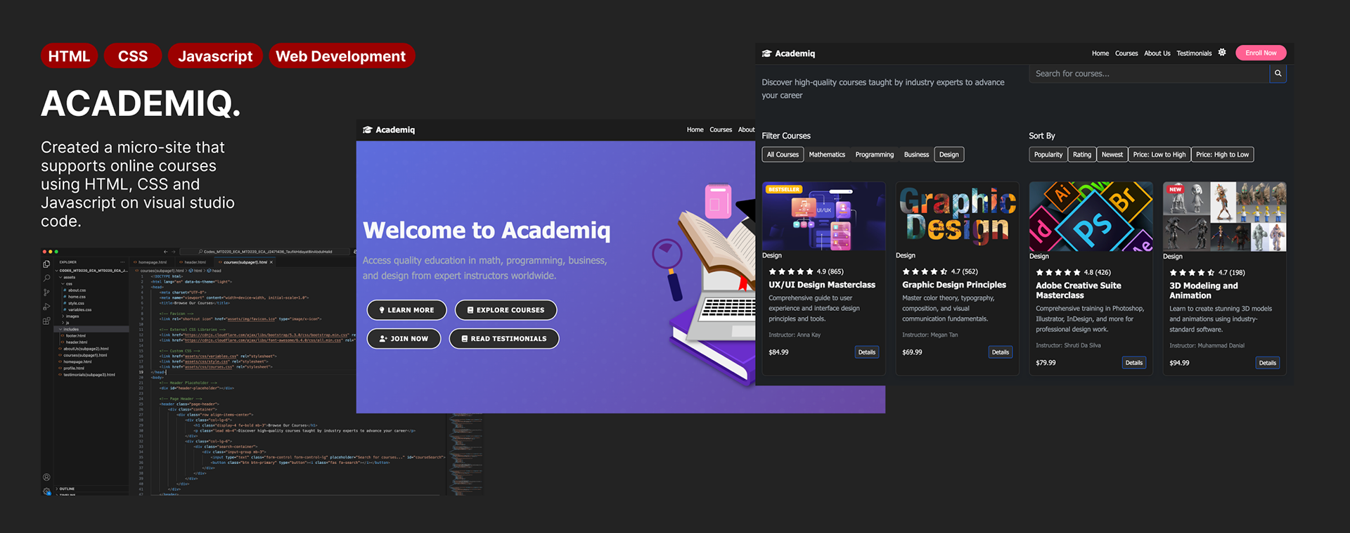 Building Academiq was both an exciting and challenging experience, especially as it was my first real dive into web development. Before this project, I had never worked with HTML, CSS, or JavaScript, and taking on the task of creating a functional and visually appealing online learning platform felt overwhelming at times. I had to learn everything from structuring web pages to styling elements and implementing interactive features, all while ensuring a responsive and smooth user experience.