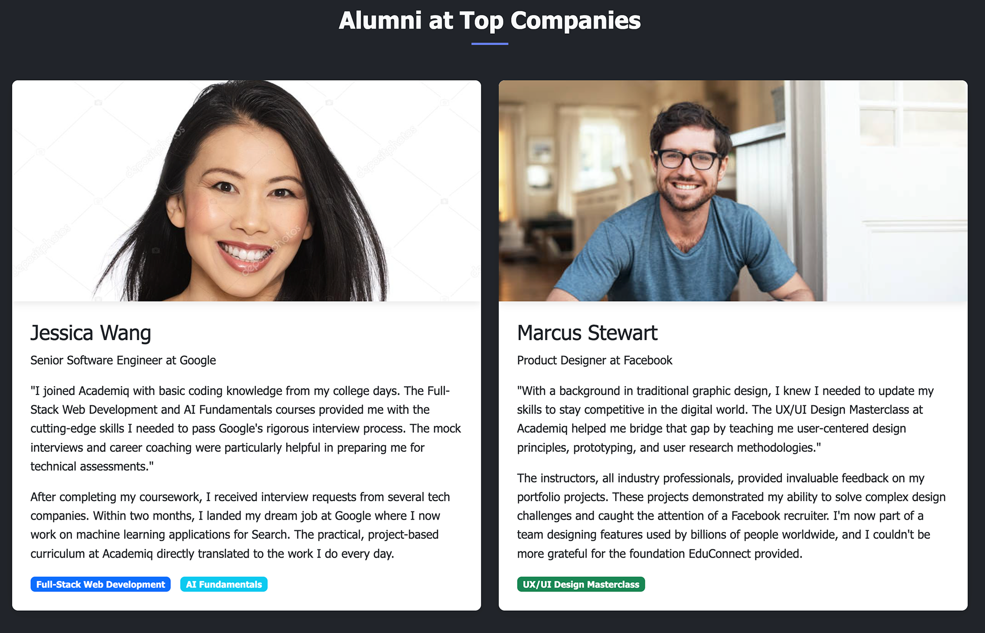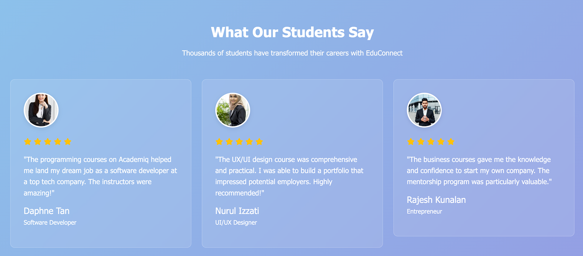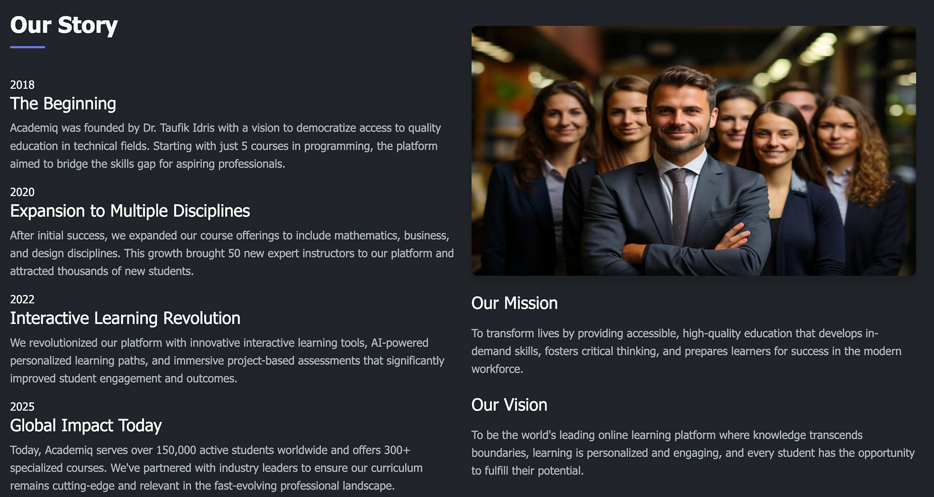 Building Academiq was both an exciting and challenging experience, especially as it was my first real dive into web development. Before this project, I had never worked with HTML, CSS, or JavaScript, and taking on the task of creating a functional and visually appealing online learning platform felt overwhelming at times. I had to learn everything from structuring web pages to styling elements and implementing interactive features, all while ensuring a responsive and smooth user experience.
