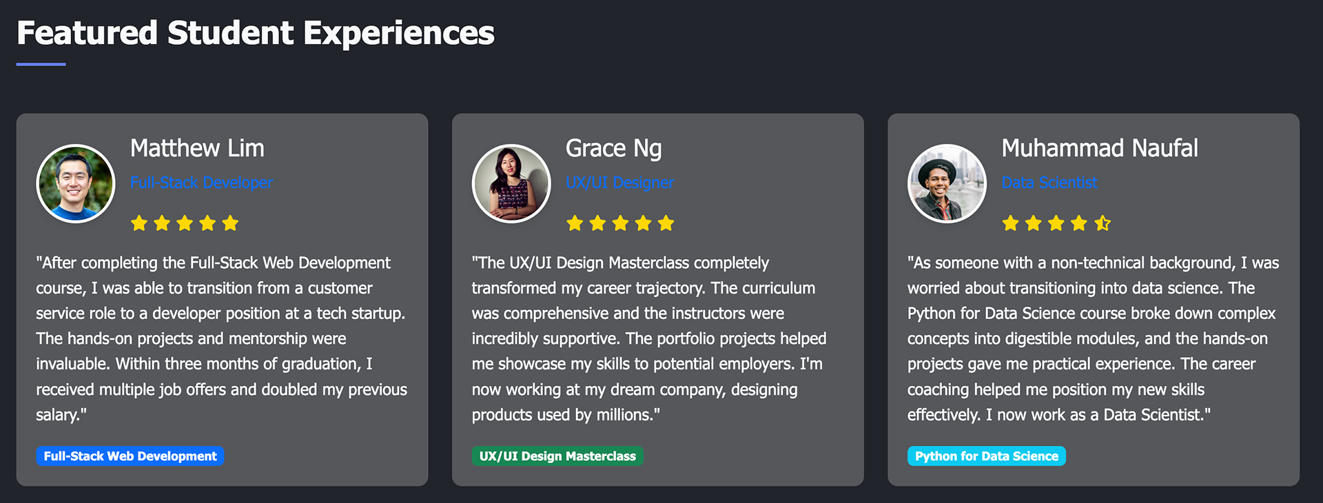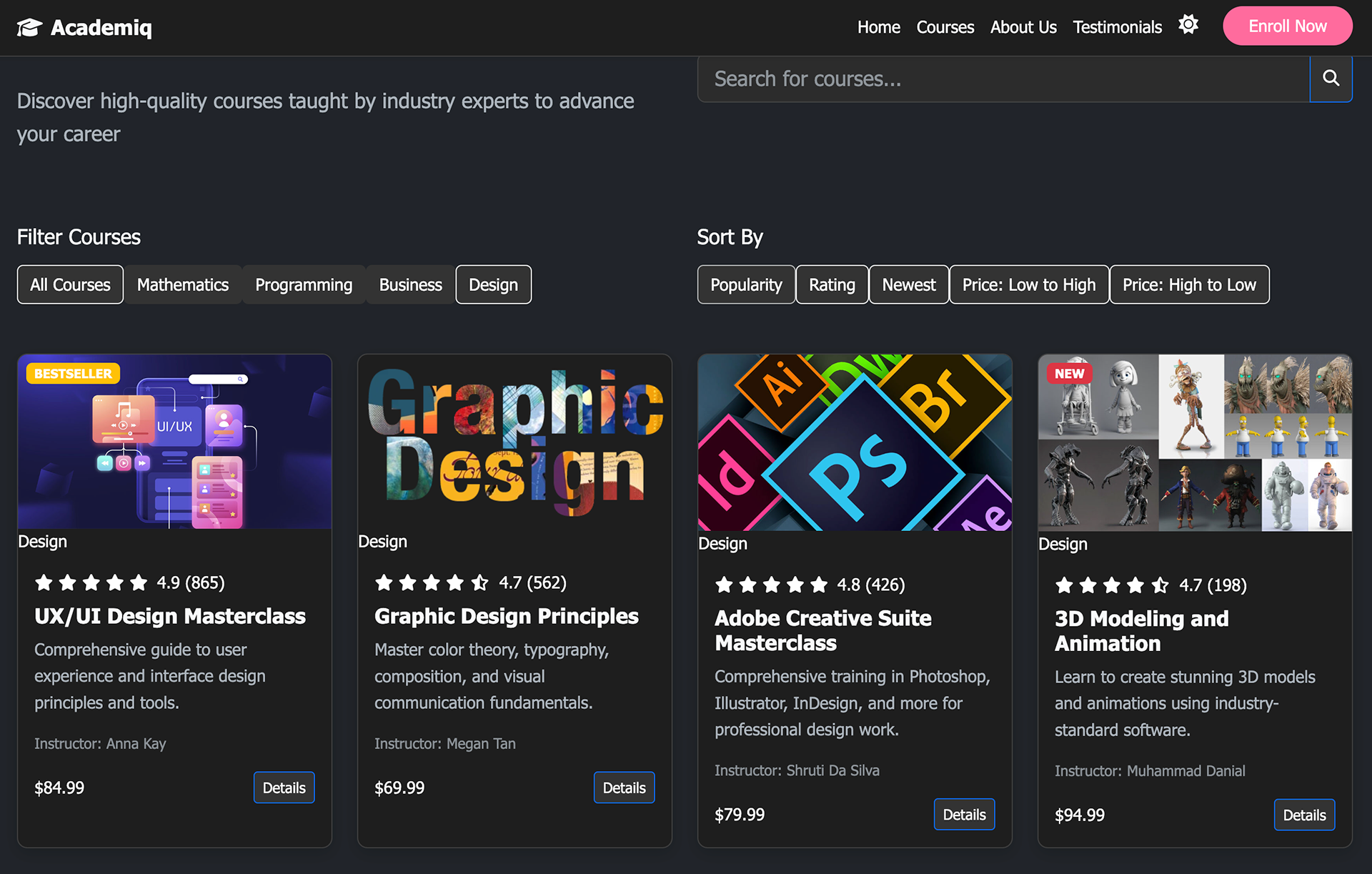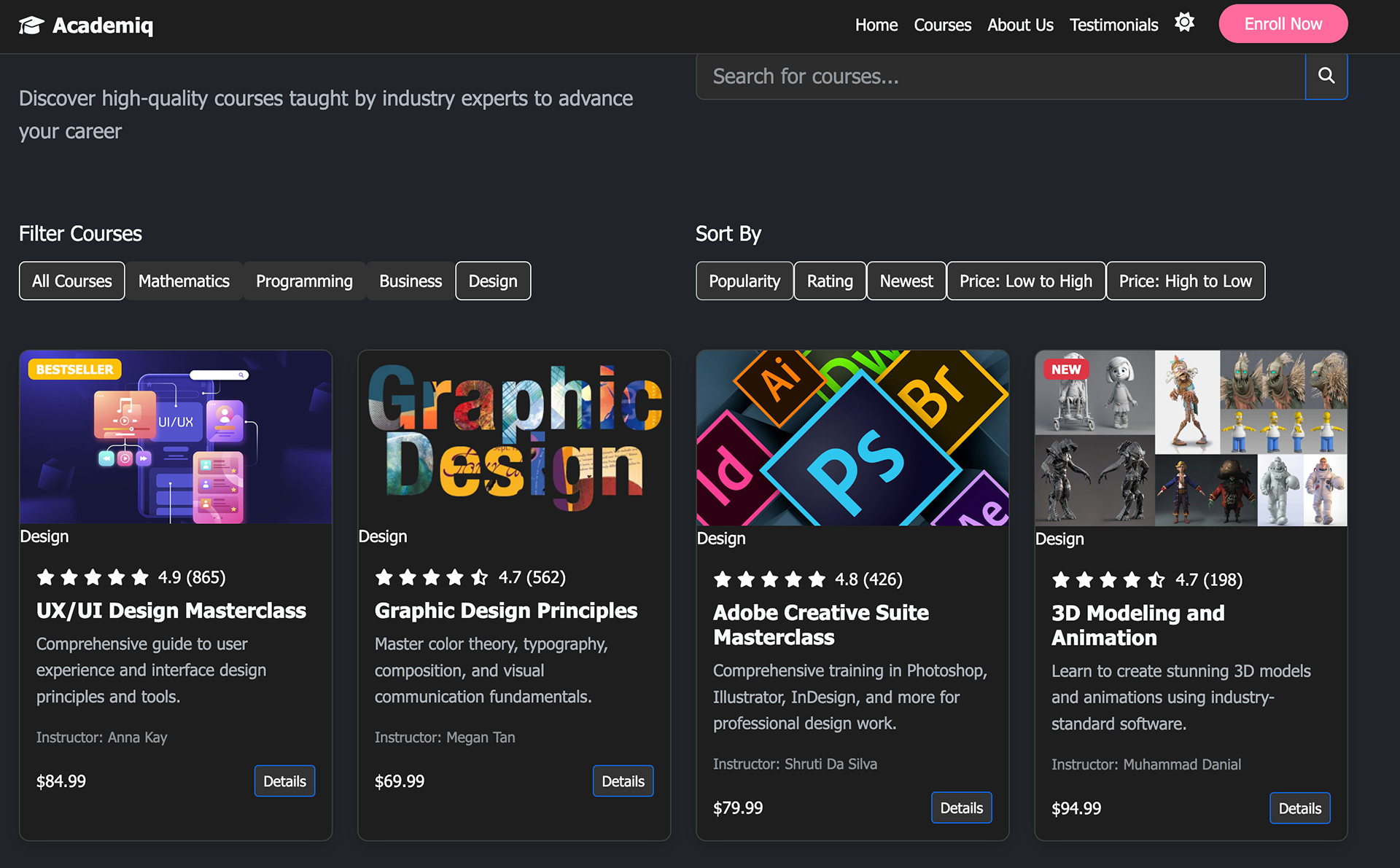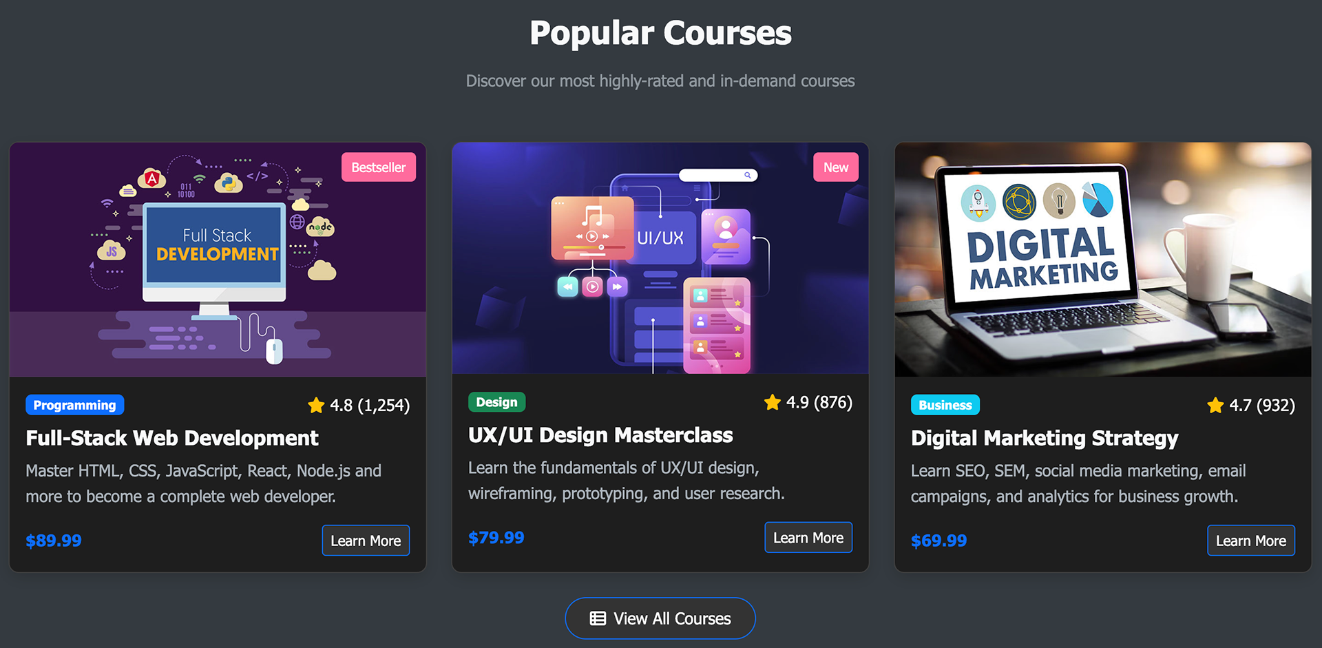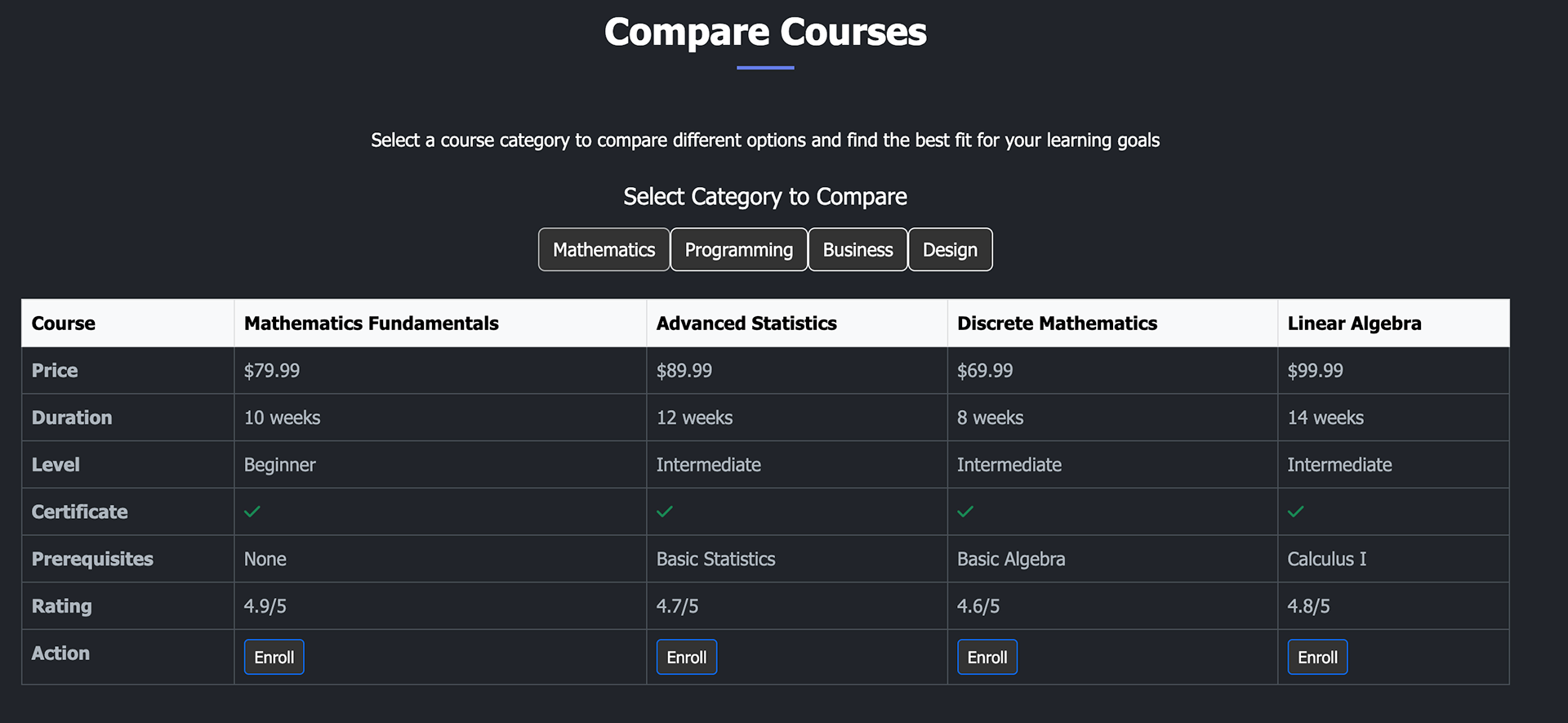 The biggest challenge was time. Completing this project in under two weeks meant intense learning, late nights, and a lot of trial and error. Debugging became a daily battle, as simple mistakes in my code could break entire sections of the site. JavaScript, in particular, was tough to grasp at first, especially when handling dynamic elements like course enrollments and user interactions.