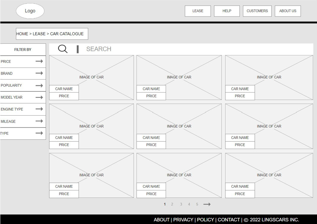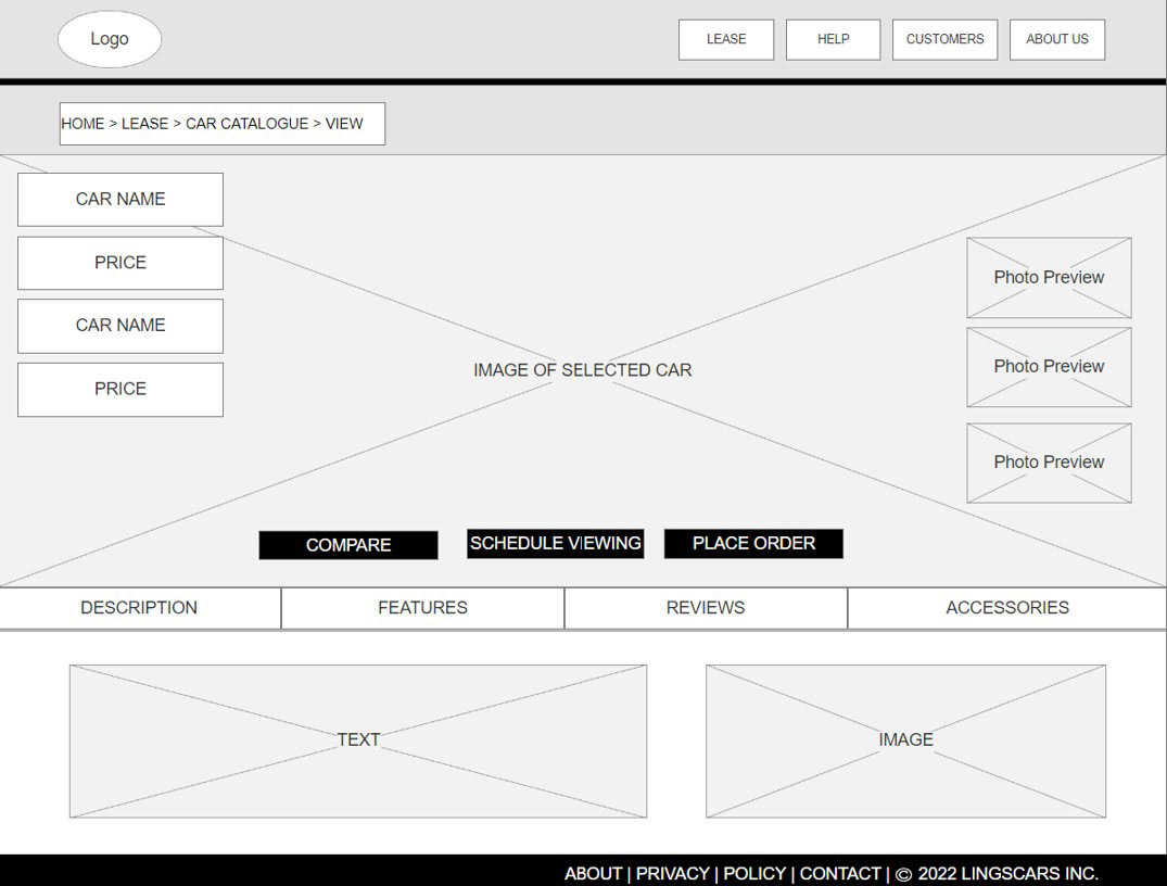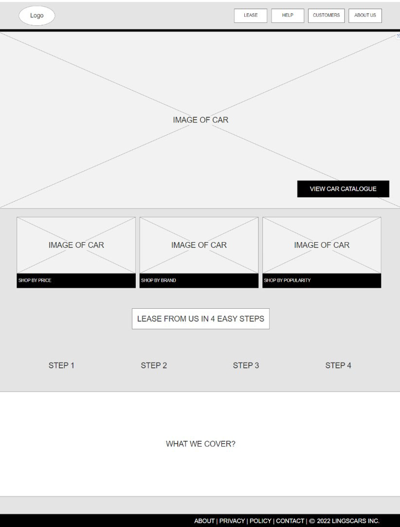 The Header and footer will be the same for all pages for the website for the purpose of consistency and ease of navigation for the users. The navigation in the header will feature common links that users will most likely use that is “LEASE” to see the list of vehicles available, “HELP” for users to see the process and all the information needed for leasing vehicles in LingsCars, “CUSTOMERS” to see the reviews and recent orders and “ABOUT US” for all information on the company.